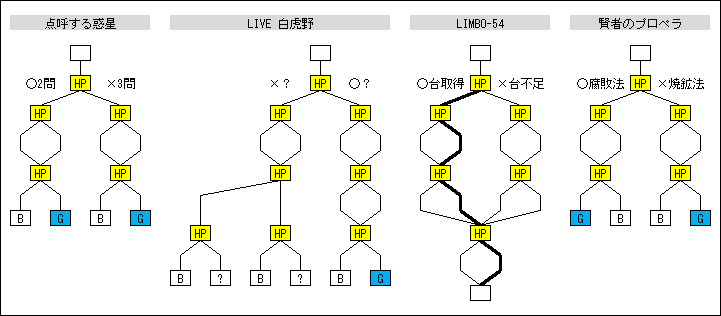 傾向と対策 このページは過去のインタラを元にまとめたものであり、今回のインタラ「ノモノスとイミューム」の解析の手助けになるかどうかは、現時点では一切不明です。 過去のインタラにおけるルート まず、過去4回のインタラのルートを確認します。 会場の役割としては、左右の選択を正しく行って、GOOD ENDINGのポイントへ移動すること。 在宅オーディエンス(宅オ)の役割としては、与えられたミッションに成功すること。 下図では、宅オのミッションが成功しているとした場合の、会場の選択に着眼して作成したツリー図です。 ![]() 会場側は、[G]と書かれた青い場所へたどり着けば良いわけです。賢者のプロペラと、点呼する惑星では、どのようなルートをたどっても、最後の選択さえ間違わなければ、[G]へたどり着きます。 一方、LIMBO-54はちょっと特殊なパターンで、会場は4つの「台」を入手しなければなりません。 「台」は太い線4か所にあり、ここを通ると各々1つ「台」をもらえるので、この決まったルートを通って4つの台を手に入れなければならないため、選択は全て正しくなくてはなりません。 第一ホットポイント 会場で左右を選択するホットポイント(HP)は、3~4回あります。 このうち、1番目のHPの選択によって、難易度が大きく変わるようです。 ■賢者のプロペラ ・(L)腐敗法:宅オの壁壊しのスピードが速い。 ・(R)焼鉱法:宅オの壁壊しのスピードが遅い。 ■LIMBO-54 ・(L)台取得:1つ目の台を取得できる。 ・(R)台不足:1つ目の台を取りそこなう。 (リカバリの手段はあるらしいが、不明かつ難解) ■LIVE 白虎野 ・(L):おそらく、3番目のHPと4番目のHPに正解しなければならず、会場GOODの確率1/4。 ・(R):4番目のHPに正解すればよいため、会場GOODの確率1/2。 ■点呼する惑星 ・(L):宅オの質問が2問で全問正解しなければならない。 (達人の回転で2つのAAROMを一度に破壊するため1問免除) ・(R):宅オの質問が3問で全問正解しなければならない。 過去のインタラでは、この4つのツアーで各々1回しかGOOD ENDINGにたどり着けておらず、その全てが難易度の低いルート、簡単なルートでしか成功していないのです。 例えば、前回の点呼する惑星では、初日にR側で会場はGOODルートを選択したのですが、宅オ側が3問全問正解と難易度が高くなり。1問外して失敗しました。 賢者のプロペラでも、焼鉱法では宅オがかなり頑張っても、ギリギリで全ての壁を壊せず、失敗したこともあります。 1番目のHPは難易度の低いルートを選択することが重要になます。 ただ、これは経験上、両ルートを見ないことには、どちらのルートの難易度が高いか低いかわかりません。 前回の点呼する惑星では、初日、二日目と難易度の高いR(3問ルート)を選択しました。最初にRを選んで2度もBAD ENDINGとなれば、最終日はLを選びたくなるのは人情です。 しかし、LルートはRルートよりも難易度が高いか低いかわからず、しかも全く通っていないので、内容がわからないルートとなってしまいリスキーな選択となりました。 私のお勧めは、初日と二日目の選択を左右に分けることです。 初日はRから始めたら、二日目はLから始める。初日がLから始めたら、二日目はRから始める。 そうすれば、偶然簡単な方だった日は、最後の選択で偶然GOOD ENDINGにたどり着けるかもしれません。 さらに、2つのルートを通っておけば、最終日は難易度の低いルートを選べますし、しかも一度通っているルートなので正しいルートをがわかるはずです。 中間ホットポイント HPが4回ある場合の2~3番目のHP、あるいはHPが3回ある場合の2番目のHPはENDINGに関係なく、単に演奏曲順や曲目のバリエーションであることが多いです。 しかし、LIMBO-54のようなルートが全て決まっているケースや、LIVE白虎野のLルートのように、関係してくる可能性がゼロではないので、注意が必要です。 最終ホットポイント 最後のHPは、過去全てENDINGに関係し、これを間違うとGOOD ENDINGはありませんでした。 強いて言うなら、行きにくい方にGOOD ENDINGがあることが多いです。 ヒラサワや他の登場人物を、助けるか/助けないかという、明らかに会場が「助ける」に決まってるじゃないかという選択であれば、ひっかけで、「助けない」にGOODがあります。 ただ、これは初見のライブでは、相当難しい選択です。一度「助ける」が失敗だったという情報があれば、次回に「助けない」ことは選べるのですが、 いきなり「助けない」は会場の多数決で勝てないでしょう。 最後に 何といっても、インタラは見ないことには始まりません。 傾向と対策は予備知識程度で、本格的な解析は初日終了後以降に頑張ります。 ライブ期間中はマメに更新することになると思いますので、またご覧いただけると幸いです。 |