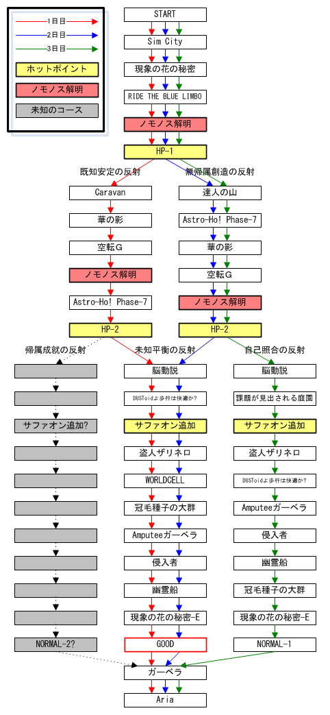 3日目終了後 取り急ぎ、インタラクティブ・ライブ・ショウ2013「ノモノスとイミューム」全公演終了しました。 関係者、参加者の皆様。お疲れ様でした。 今回のインタラは、平沢氏が言われていた通り、ルートとしては簡単でした。 エンディングは3パターン。平沢氏的には、初日に「帰属成就」と「未知平衡」で、「未知平衡」を選んだのだから、二日目は「未知平衡」と「自己照合」なら、 「未知平衡」は選ばないだろう。「自己照合」へ進むだろう、と考えて「3日で3パターン通る」という目論見だったのだと思いますが、それは結構難易度高いですよ。 誰もがライブ中に通ったルートやキーワード、曲目をメモして、ツリー図書いてるわけじゃないんですから(笑)。 せめて、「赤」「青」「黄」とか、「空」「海」「山」とかなら覚えますけど、「帰属成就」と「未知平衡」なんて皆が覚えていると思ったら大間違い(笑)。 基本的には、宅オログの番地がなくても、反射の名前を頼りにツリー図が書けるということだと思うのですが、 前回の点呼では「てんびん座HD139518」とか「とかげ座HD214558」とか、同じ名前なのに違う場所とかありましたからね。 同じ名前でも、本当に同じルートかどうか、多少は疑ってかかってしまいます。 ![]() 最終日のエンディングは、ノモノスがハーンドマーイク!に変わるというオチで終わりました。 個人的には、劇中のサンミアの「あなた達は、植物園が爆発する世界か、永遠に静止した世界に戻るしかなくなったの」(うろ覚え)というセリフがあります。 それからすると、「爆発物となったノモノス」という出発点から、「植物園に初期ノモノスとして返す」となっても「つくば山頂でハンドマイクに変わる」となっても、あまり差はないというか、これでBADとは書きにくいですね。 ただ、Amputeeガーベラを見つけてもそれを活かせず、植物園にもノモノスを戻せなかったので、GOODでないのは確か。ということで、NORMAL ENDINGとしておきました。 発端(CALL ヒラサワ)でチラチラと映る様々なシーンの断片に、赤いワンピースを着た大柄の女性が映るのですが、彼女が「帰属成就」のストーリーに登場する「赤の女王」なのでしょう。 こちらのエンディングもDVDでは収録してもらえると嬉しいのですが。 これで3つのエンディングが明らかになったのですが、ということは、ノモノスの解明失敗や、サファオン不足の場合はいったいどうなったのでしょう。 サンミアがゲームオーバーを告げて、ノンタラになったのでしょうか。 ほとんど通ることはないであろう、ノンタラの為に曲データを用意するでしょうか。用意してなくてストーリーが無いだけとなるなら、本当に3日ともゲームオーバーにならなくて良かった(笑)。 最後に、宅オ情報を送ってくださった月橘さん、ありがとうございました。 かなりパーフェクトに情報を集めてくださっているので、ちょっと時間はかかりますが、まとめて宅オのページも追加したいと思っています。 本当に有益な情報をありがとうございます。 |