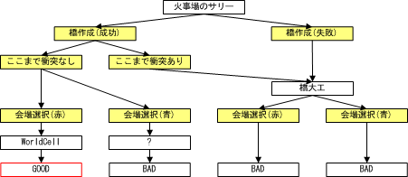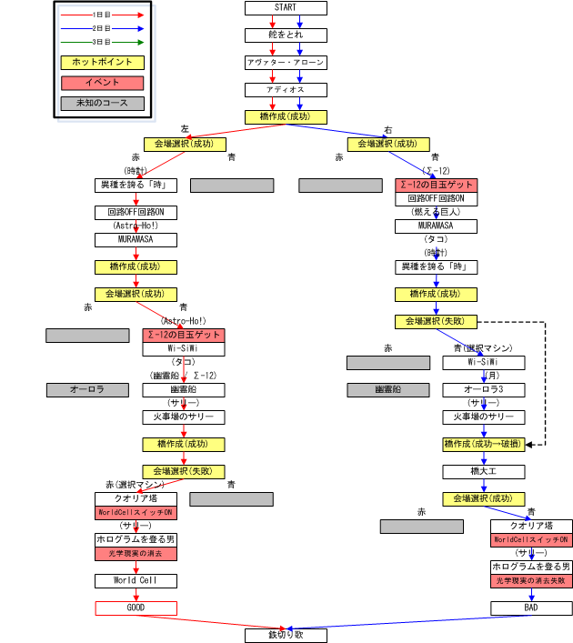 2日目終了後 まず、結論から。 明日、GOOD ENDINGを目指すのであれば、一番簡単なのは、初日と同じルートを通る方法です。 コード・シューターは「左」、会場は「赤、青、赤」。 ツリー図と解説 では、解説です。まずはツリー図。 ![]() ■気になる点 その1 橋を修復するために「橋大工」が演奏されました。そして、BAD ENDINGなので「World Cell」が演奏されませんでした。 アンコールはともかく、過去のインタラでは、どのルートを通っても曲数は同じでした。アルバム曲は全て必ずやるはずで、アルバム以外の曲に関しては曲目は違っても、曲数は同じでした。 曲数を揃えるのであれば「橋大工」が演奏された時点でBAD ENDING確定で「World Cell」が演奏されないということになります。 (もっと言えば、全ての橋が架かり、「橋大工」が演奏されなかった場合、ルート間違い等でBAD ENDINGであれば、何か1曲演奏するでしょう。) ■気になる点 その2 初日と2日目では、Σ-12の目玉を入手する時期がかなり違います。 これは、「最初の会場選択」から「火事場のサリー」までは左右が交わらないことを意味しています。 交わってしまうと、Σ-12の目玉を入手するシーンが2回だったり、1回もなかったりしてしまうからです。 逆に言えば、「火事場のサリー」以降は、どこかで左右のルートが収束して1ルートになっている可能性もあるということです。 ■気になる点 その3 2日目のルートでは、最初にΣ-12が幽霊船に乗るとほのめかし、ワンシーンだけ幽霊船がでています。しかし2日目では幽霊船はその後出てきません。 2日目に「オーロラ」が演奏された場所で、初日は「幽霊船」が演奏されました。 おそらく、右ルートでも左ルートでも、オーロラのルートと、幽霊船のルートがあるのだと思われます。 特に「その1」についてまとめると、おそらくこういうロジックではないかと思うのですが… ![]() まず、初日の左のルートですが、火事場のサリーの後で、橋が出来て、しかもここまで1度も衝突が無い場合の会場選択で、赤選択、または衝突で選択マシンが赤を選んだ場合はGOOD。 青選択、または衝突で選択マシンが青を選んだ場合はBAD。 ここまでで衝突があり橋が破損している、またはコール・シューターが橋をかけ損ねている場合は「橋大工」を演奏。ここは赤・青・衝突どうであれ、BAD。 右ルートも全く同じロジック(火事場のサリーで全て収束して同ルート)でもいいのですが、平沢氏が「成功ルートはもう一つ」あるとツイートしているので、右ルートはロジックはそのまま、GOODの赤青反転かもしれません。 …ではないかと思うのですが、なにぶん2回のライブでは確証がとれないため、確実にGOOD ENDINGにするには、初日と同じルートを通ることです。 ただ、初日は3回目の選択で赤青衝突となってしまい、選択マシンに赤青を委ねましたが、赤選択を確実にすべきかと思います。 まずコード・シューターが「左」を選択すること。 会場は「赤、青、赤」にすること。衝突をおこさないこと。 これがGOD ENDINGの可能性が最も高いと考えます。 今までのインタラのような左右選択の場合は左右比がほぼ五分五分であっても、僅差でも多い方が選ばれますが、今回は赤青が僅差では衝突してしまうので、圧倒的に片方に寄らなければなりません。 それには、皆が協力する、片方が大きそうだったら、そちらに合わせる、ということが必要になります。 今回は初日でGOOD ENDINGが出ましたが、実は、なかなか難易度は高いようです。 少しだけ補足 このページでは、初日と同じルートをお勧めしていますが、「皆さん同じようにしてください」と言っているわけではありません。 皆さんの1票は、皆さん自身のもの。 オーロラを聴きたい人、幽霊船を聴きたい人、橋大工を聴きたい人、もう一つのGOODを探したい人、それぞれ思う行動をすれば良いと思いますし、 ツリー図を見れば(もちろん、これが当たっていればという前提ですが)、個々人が望む道を選べると思います。 もし、私が1人でこのゲームをしているのであれば、解析する者として、初日と同じ道を通るなんてつまらない選択です。 私なら「World CellのGOOD ENDING」「橋大工のBAD ENDING」の他にもう一つあるだろうと想像している「未知のBAD ENDING」を目指します。 もちろん、できるだけ今まで通らなかった道を通りながら。 その一方で、私は初日に会場で見ていますが、ぜひあの大和久さんが作られた、美しいWorldCellを大勢に人に見てほしいし、 緑のレセプターが飛び交う感動を、もう一度会場全体で、在宅でUstreamを見ている皆さんも含めて、共有するのは悪くないと思っています。 このページが「GOOD ENDINGへの道」である以上、最終日に「どうしたらGOOD ENDINGが見られますか」という閲覧者に対し、 現時点の私に、できるだけ確実にGOOD ENDINGへ行けるルートを示すことは必須だと思うのです。 (それが合っているのか、それに従うかどうかはまた別の話です。) 私のアカウントのフォロワ