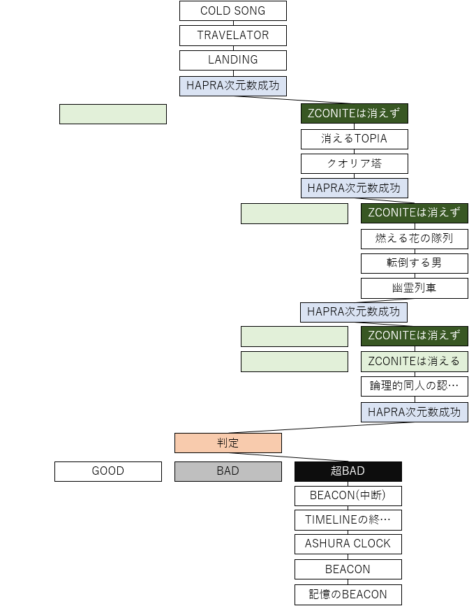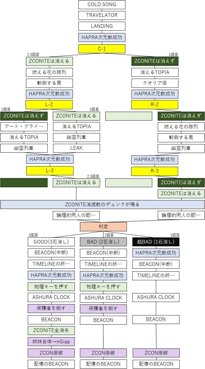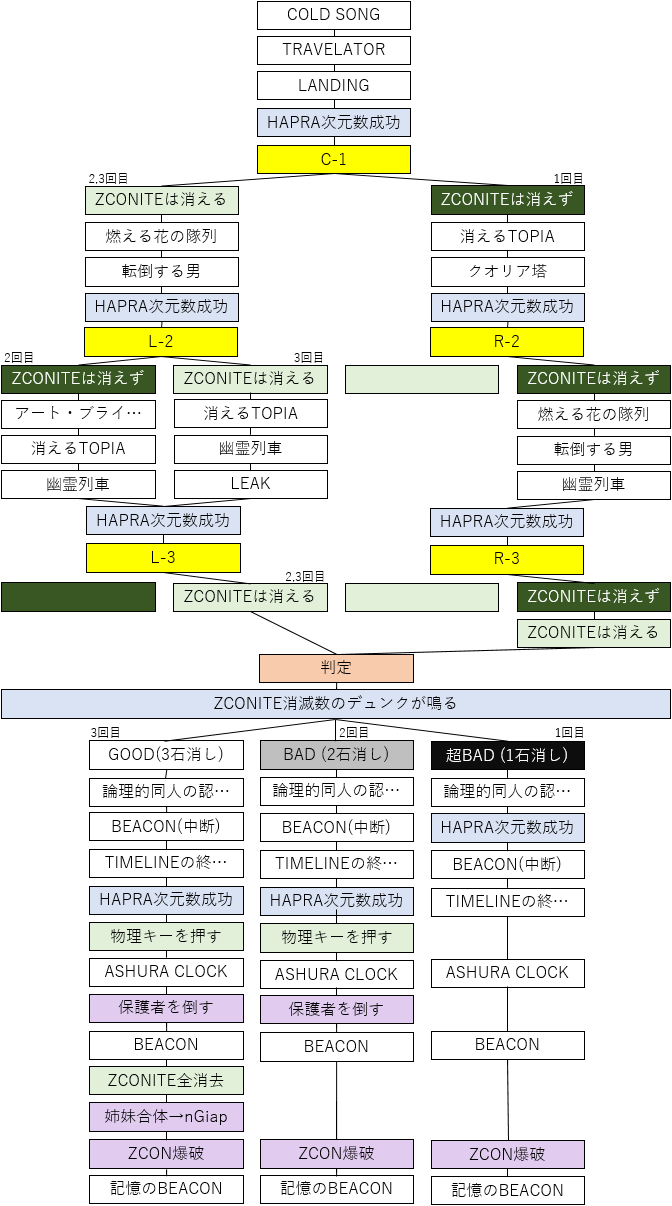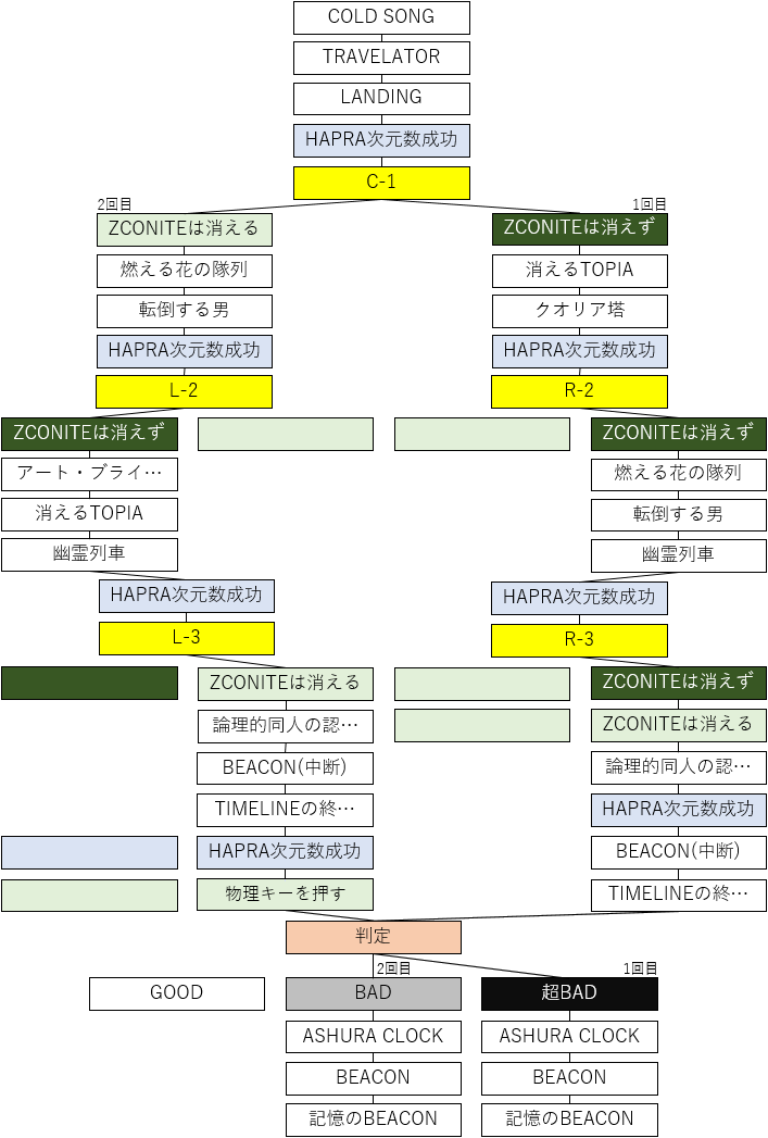 ただ、このようにツリー図を書けば一目瞭然。 分岐点2は「C-2」として収束すると、C-1でL、C-2でRと選択した場合、「燃える花の隊列」「転倒する男」がダブって演奏されてしまいます。 つまり、分岐点2は「L-2」「R-2」に分かれるしかない。 ZCONITEが消えず、を通らない道は、L→R→Rしかありません。。(続く)
