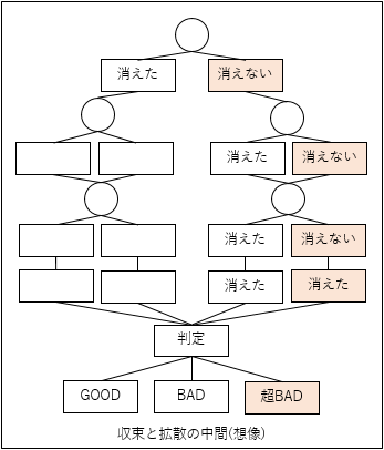 公演1終了後 (2022/03/25 夜) こんなの読んでる時間のなんか無いという人へ。 3/26 昼公演は、「最初はL」あとはご自由に。 ということで、時間のある人に向けてその詳細を書いていこうと思います。 ちなみに、すばらく放置していた「ひ組」にアクセスしたらエラーになったので、色々いじってみたが原因が分からない。 半年ぐらい前に見たときはちゃんと動いていたが。インタラ終わったら、じっくり調べて直す。今回は時間がもったいないのであきらめた。 前提その1 インタラクティブ・ライブ(以降、インタラと呼称)は、会場の選択と在宅オーディエンス(以降、宅オと呼称)により、 複数のストーリーの中の1つのルートを辿り、GOOD、BADなどの異なるエンディングの中から1つのエンディングを迎えます。 基本的には、GOODエンディング到達を目的とするRPGのようなものです。 複数回の公演のうち、初回は情報が無いために手探り状態で、回を重ねるごとに全体像が見えてきて、GOODエンディングへの道が見えてきます。 前提その2 私の考察は、私個人の感想であり、正解を保証するものではありませんので、分岐などの選択は皆さんのご自由に。 また、私は解析をして、それを言いたいだけで、会場の結果を変えたいわけではありません。 (そもそも、ひ組Twitterのフォロワー数なんか、会場の人数からすると微々たるものですが。) 前提その3 私の解析は、会場のルートのみ。宅オ(天候技師)の皆さんの作業(HAPRA次元数の設定)は成功する前提ですので、よろしくお願いいたします。 初日の事実確認 ・初日の会場の分岐点は3つ。初日の選択はR-R-R ・クライマックスでの黒平沢のセリフは、「たった1音か。何たることだ。デュンクの構成音が3つも足りない」 ・エンドロール後、演者紹介の後に白平沢が言ったセリフは「初日から"成功ルート"ではなく"最も失敗ルート"を辿ってくれた皆さん、ご苦労様でした」 ・本人のTwitterにて「良いエンディング、ダメなエンディング、まったくダメなエンディング」の3つのエンディングがある ・宅オの作業は4回。初日は全て成功。 初日の事実確認からの考察 会場の分岐点は3つ。初日の選択はR-R-R。 おそらく、会場のミッションは、分岐点で正解のLまたはRを選択し、ZCONITEを消去すること。 クライマックスでの黒平沢のセリフは、「たった1音か。何たることだ。デュンクの構成音が3つも足りない」とのこと。 4音集める = 4つのZCONITEを消すんでしょうね。 エンドロール後、演者紹介の後に白平沢が言ったセリフは 「初日から"成功ルート"ではなく"最も失敗ルート"を辿ってくれた皆さん、ご苦労様でした」とのこと。 ちなみに本人のTwitterにてエンディングは 「良いエンディング、ダメなエンディング、まったくダメなエンディング」の3つであることがわかっており、 「最も失敗ルート」は「まったくダメなエンディング」と考えるのが妥当ではないでしょうか。 以降、この3つのエンディングは「GOOD」「BAD」「超BAD」と呼称します。 また、「最も失敗エンディング」ではなく「最も失敗ルート」と表現されたのは、意図的か無意識か、 会場の選択(ルート)が最も最悪(3回ともミス選択)と取ることができます。 最後に、宅オの作業は4回。初日は全て成功。 会場は3回の分岐点があり、それぞれZCONITEが消えたか消えないか表示されましたが、 分岐点3の時だけ、「ZCONITEは消えません」「ZCONITEが消えました」と2つの結果が出ました。 ただし、時系列では、 ・HAPRA次元数成功→会場R選択:「ZCONITEは消えません」 ・HAPRA次元数成功→会場R選択:「ZCONITEは消えません」 ・HAPRA次元数成功→会場R選択:「ZCONITEは消えません」「ZCONITEが消えました」 ・HAPRA次元数成功 となっており、ZCONITEが消えたのは4回目のHAPRA次元数成功より前なので、これが理由ではないようです。 なお、前提にも書いた通り、ここでは、宅オの作業は全て成功する前提で、書いていきます。 ルートの形について 3つの分岐がある場合、毎回収束する「収束型」や、毎回拡散する「拡散型」があります。 過去のインタらから、おそらくはこの中間にある収束と拡散が混ざったルートになっているのではないかと思います。 何故なら、今回は分岐の直後に「ZCONITEは消えません」「ZCONITEが消えました」という結果が出ることで、 その選択が正しかったか、間違っていたかが分かり易く、もし収束型であれば、間違ったルートの反対を行けばいいので、 簡単すぎるからです。 逆に、毎回拡散すると8つのルートができ、3回の開催では通らないルートが多すぎて、無駄であるし難易度が高い。 ![]() 根拠は全くないのですが、過去のインタラのルート図から、だいたい下図ぐらいが難易度としては妥当ではないかと思います。 ![]() 過去のインタラでも、左右に大きく分かれ、片方が難易度が高く、もう片方は難易度が低い、ということが多い。 今回も、分岐点1でZCONITEを消せない右側は難易度が高く、初日では通らなかった(おそらくZCONITEを消せ