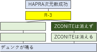 右ルートにもあるGOODの可能性 まずは、完成版のツリー図。 ![]() 1つ、気になることがあります。 それは、初日の分岐点3「R-3」で、「HAPRA次元数成功」→「ZCONITE消えず」となった後に、 突然「ZCONITE消える」となったこと。 初日の段階では。そういうものかと思いましたが、二日目の昼、夜の分岐点3「L-3」では、 「HAPRA次元数成功」→「ZCONITE消える」となり、その後にはZCONITEが消えるとも消えないともなく、 ずっと後のASURA CLOCKの前に「HAPRA次元数成功」→「ZCONITE消る」となります。 こうやって図を書いてみると、「R-3」のR選択では、とってつけたようにZCONITEが消えたようになっています。 いったん話をリセット。 ここで、分岐点1,2,3について、全て成功すれば3つのZCONITEが消せて、全て失敗するとZCONITEが1つも消せないわけですから、 消去数は、0,1,2,3の4パターンになります。 ところが、全て失敗した初日は、突然1つZCONITEが消えたことになって、0の可能性が無くなり、1,2,3の3パターンになります。 となると、GOOD、BAD、超BADの3つのエンディングに対応できて、とても都合がいいことになります。 また、流石に3回の選択で、消えない、消えない、消えない。では希望がなさすぎるので、お情けで1つ消えたことにしてくれたのかもしれません。