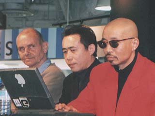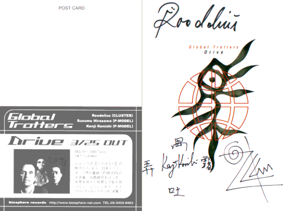 現代的な感じがするが,現代的音楽は聴いているかという質問に対し,ハンス氏は「忙しくて聴いている時間がない.カーラジオで聴く程度.傾向は知っているが詳しい訳ではない」と言い,小西氏が「ここの3人は一緒(現代音楽に明るくない)」とコメント(笑). これは意訳すると「皆さんいい年齢ですが,最近の流行とかわかります?」という質問に「ワシら,よくわかってないんだけど」と回答したということである(笑). ここでグロトロに参加した他のメンバー,アルミキア/フェリックス・ジェイ/デイヴィット・ビックレーの簡単な紹介の後に曲の作成の行程の説明. まず,ハンス氏サイドで作成した「Parallel Motives」のオリジナルバージョンが再生された. 続いて小西氏がこれに「生ベース,生シンセ,生短波ラジオ」を追加したハンス-小西バージョンを再生.小西氏は(ハンス氏と自分の)タイミングの見方が似ており,ここで音を入れようと思うと既にキュイーンと音が入っている,だからそれを避けながら音を追加している,とコメント. 平沢氏はさらにその後に音を入れるのでもっと大変ですか?という質問に対し,「それよりも小西が「生短波ラジオ」なんて単語を使うから通訳が困ってます(笑)…という感じです」と楽しそう(笑). 小西氏の「アップルCDプレーヤーを操作します」のかけ声で,最終的なバージョンが再生される. ハンス氏が「タイコドラム(タイコは和太鼓の意)」と言っているものが,実は「音源はドイツものです」とコメントする平沢氏(笑). 衝撃の発言 さて,今度の活動について,平沢氏はグロトロを続けるかどうかはわからないと断った後に,MP3について語った.出来るだけ本人のセリフのまま載せます. MP3という技術はミュージシャンの立場を大きく変える可能性を持っている.ということで実はこれはぜひ覚えておいてください.「MP3」です.このキーワードを知っておくと今後のP-MODELの活動がより面白くなるのではないかと.で,これがつまりインターネットの中を自由に飛びかえるファイルであるということから世界中の人たちと共同作業ができるチャンスが我々にいっぱいあるので,是非色々な形で試行錯誤をしていきたいと考えております. ハンス氏の今後の行動はアイルランドやイタリア等のミュージシャンとのコラボレーションが予定されているなど,多忙な状態を語った. 同様に小西氏に今後のP-MODELの活動を尋ねると「訊かないで下さい.大将に訊いて下さい」と笑いながら返答した. そして次にまたもや平沢氏の口から本日最も重要な発言が… (P-MODELの作品については)発表するタイミングを準備しております.で,それまでは一切ちょっと明かせません.が先ほど皆さんに覚えていただいたキーワードというのが大きなカギになります.おそらく日本ではプロのミュージシャンというのはそこに踏み切ったミュージシャンはいないだろうし,世界的にいっても大胆な行動を半年間の間にわたってやり続けます.記者発表にご期待下さい(笑). 以上,これにてインタビューは終了となった. 考察 さて,上のコメントや最近の雑誌のインタビュー等から「P-MODELの次回作はMP3でシェアウェアデータとして発表される」ことがほぼ確実となった. ある意味,「PCを持っていないP-MODELのファンはどうなるのか?」という問題に対する回答であると私は考えている.パソコン通信/インターネット/CD-EXTRA/オンラインゴースト…と数々のメディア/ツールを使うことで,「PCを持っていないファンが楽しめない」というデメリットを超えて「即時性のある情報交換,多彩な表現手法」というメリットがあったはずであり,これからも新たなメリットの為に彼らは様々なメディア/ツールを使っていくだろう. P-MODELは単に目新しい技術としてMP3を使いたがっているわけではなく,現在の音楽産業におけるP-MODELの立場から,新たなマーケティング方法のツールとしてMP3を採用したことは想像に難くない.現在の音楽業界の手段ではできないこと…それは「MP3」がインディーズレーベル「旬」に取って代わる可能性も秘めている. さぁ,とりあえずMP3プレーヤーをインストールするのだ!(笑) ポストカード ![]() インタビュー終了後,HMV新宿でDriveを購入した者に直筆サイン入りポストカードがグロトロメンバーから直接手渡された.しかし,愚弄吐露とは一体…?(笑) 【愚弄】ぐろう (意)ばかにしてからかい,その価値を認めないような扱いをすること。 (例)先生を愚弄する言葉を吐く。 【吐露】とろ (意)自分の意見・気持ちなどをかくさずに述べること。 |