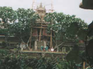 まず,この絵ハガキの一枚目は単に緑の錠剤の説明.二枚目は地理的なヒント.緑の錠剤は泉のほど近くにあると.三枚目の「巨人が爪を立てた山」はグヌン・カウイそのもののこと.伝説では,ここの一枚岩のレリーフ(埋葬塔)は,その昔恐怖の巨神クボ・イワがその爪で削ったものだと言われている(市販のガイドブックより.情報提供のまうさんに感謝!). 我が5班は3番目の場所で倫テノさんと出会い,3枚の絵ハガキをゲットしたことを説明すると「(他の班に比べ)早すぎる!」と驚かれる.これで今日の探索は終了なので,ゆっくり食事をした後に楽器屋,レコード屋,おみやげ屋などで遊ぶ. 夕食,カフェ・ロータスにP-現る!