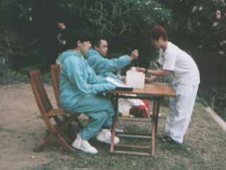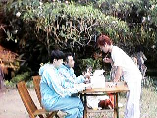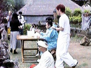 探索と食事,買い物をすませた免疫団は夕食のためにカフェ・ロータス(ウブドゥ村)にバスで移動.カフェ・ロータスには蓮池があり,しばらく待たされた後(笑),その向こう側のステージらしき場所へP-3名が現れた!蓮池を挟んで団員がカメラやビデオを構える.小西さんだけがいつもの防菌服ではない.団長の指示通り一班ずつP-の側へ行く.小西さん(胸にはTEMP 5DEMのネームプレート.一人二役?)にお清めを受け,ピンクの錠剤を入れていた空の小瓶に平沢船長から透明の液体をいただく.そして福間船員からは新たなメッセージが団員一人一人に手渡される.