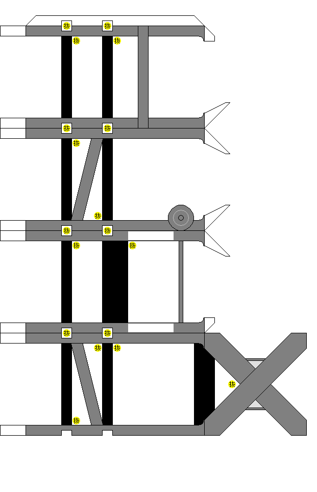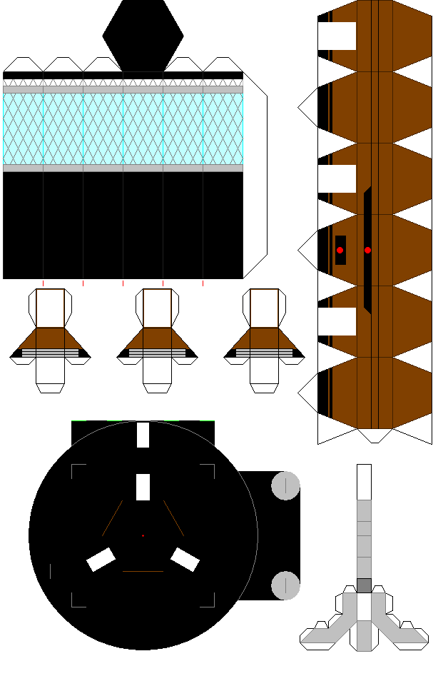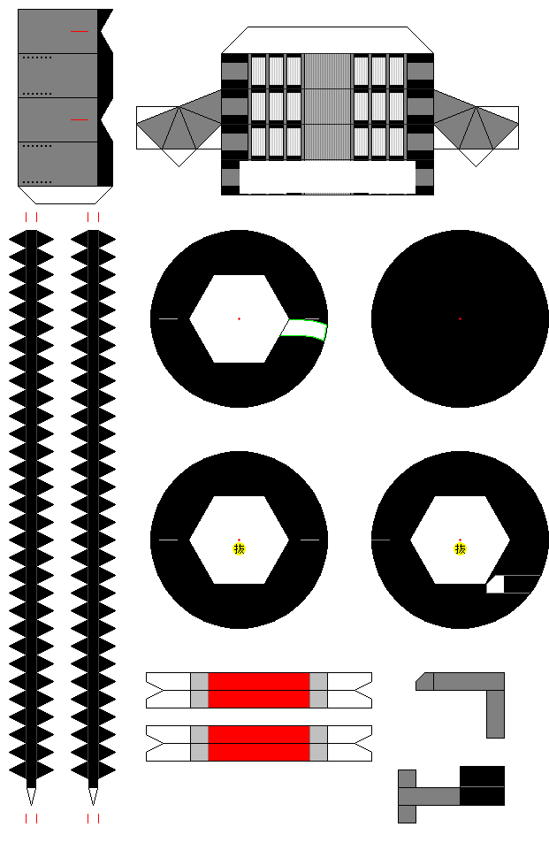 型紙1~4は厚さ0.2mm程度の「厚手」の紙をお勧めします。大手電気店などのプリンタ用紙売場で入手できます。仕上がりも普通紙よりもプリンタ専用紙の方が綺麗です。 型紙5,6は普通紙(コピー紙)か、同等の厚さの紙に印刷して下さい。 赤い線は補助線です。カッターで折れ目を付ける場合や、パーツの裏表を合わせる場合、必要に応じて使って下さい。 黄色い(抜)マーク、また型紙3の黄色い部分はカッターで抜いて下さい。型紙2の黒丸の中の六角形は(抜)マークのある2つは抜きますが、マークのない1枚は抜きません。 印刷方法は、インターネットエクスプローラーから直接印刷するか、 画像ファイルをBMPで保存して、ペイントで印刷してください(Windowsの場合)。 |