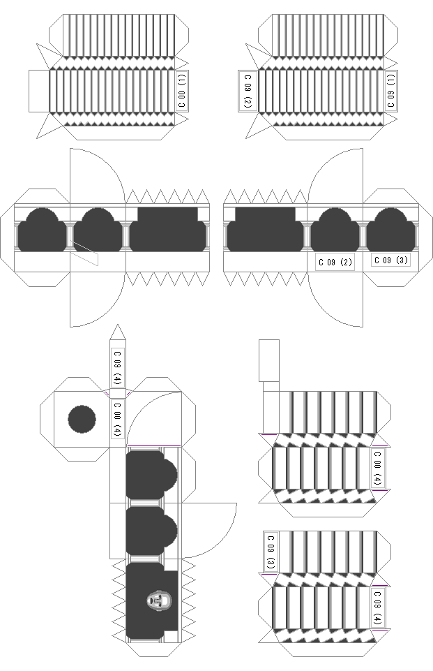 今までの上級者向けペーパークラフトと同様、作成を簡便にするためディテールを簡略化したり、 強度を確保するためシルエットを太くしている箇所があります。 各パーツの組み立てはそれほど難しくはありませんが、本サイトのペーパークラフト中で、 過去最大の印刷枚数、パーツ数であり、完成品も過去最大のため、作成時間はかなり必要です。 トゥジャリット自体の著作権はCGを作成した大和久 勝 氏とケイオスユニオンにあります。 印刷した型紙や完成品の売買、二次使用などはご遠慮ください。よろしくお願いします。m(_ _)m 型紙は全部で10種、印刷枚数は14枚です。 Windowsの場合は、インターネットエクスプローラーから直接印刷するか、 画像ファイルをBMPで保存して、なんらかのソフトで印刷してください。